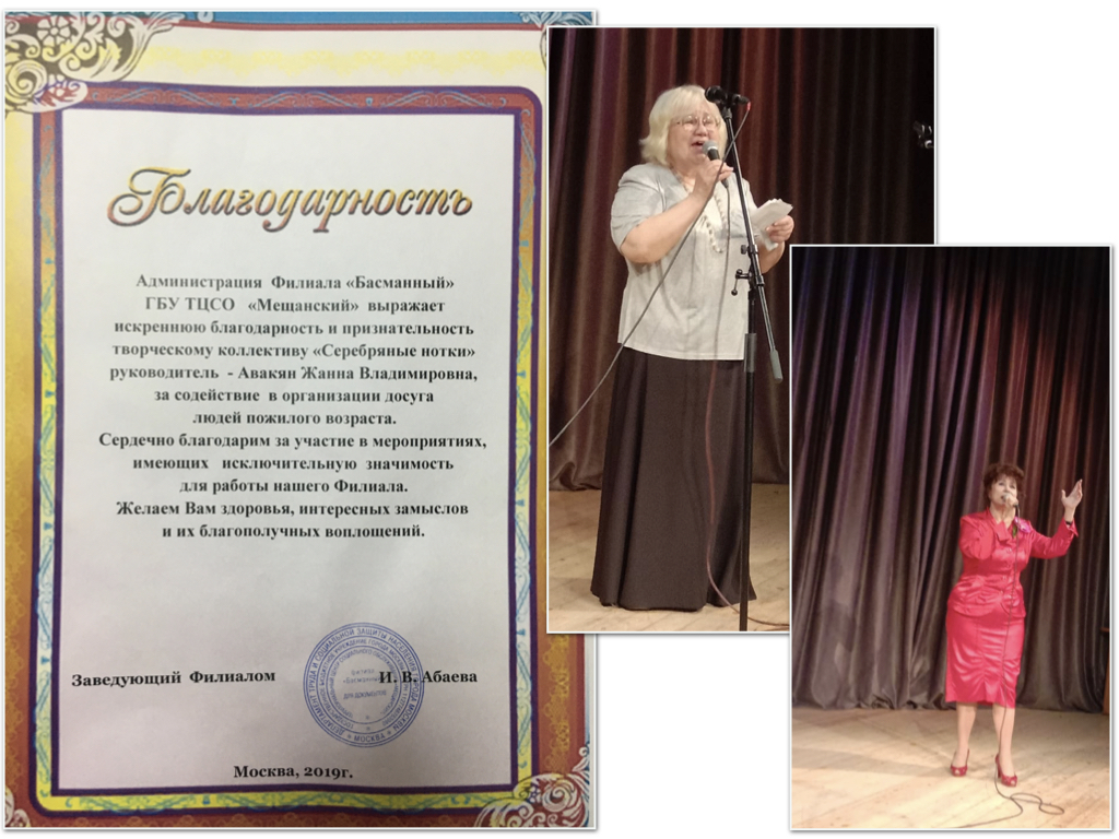 В рамках проекта "Московское долголетие" 15.05. 2019 в филиале "Басманный" ГБУ ТЦСО "Мещанский" состоялся концерт хора "Серебряные нотки", посвященный 74-й годовщине Великой Победы.