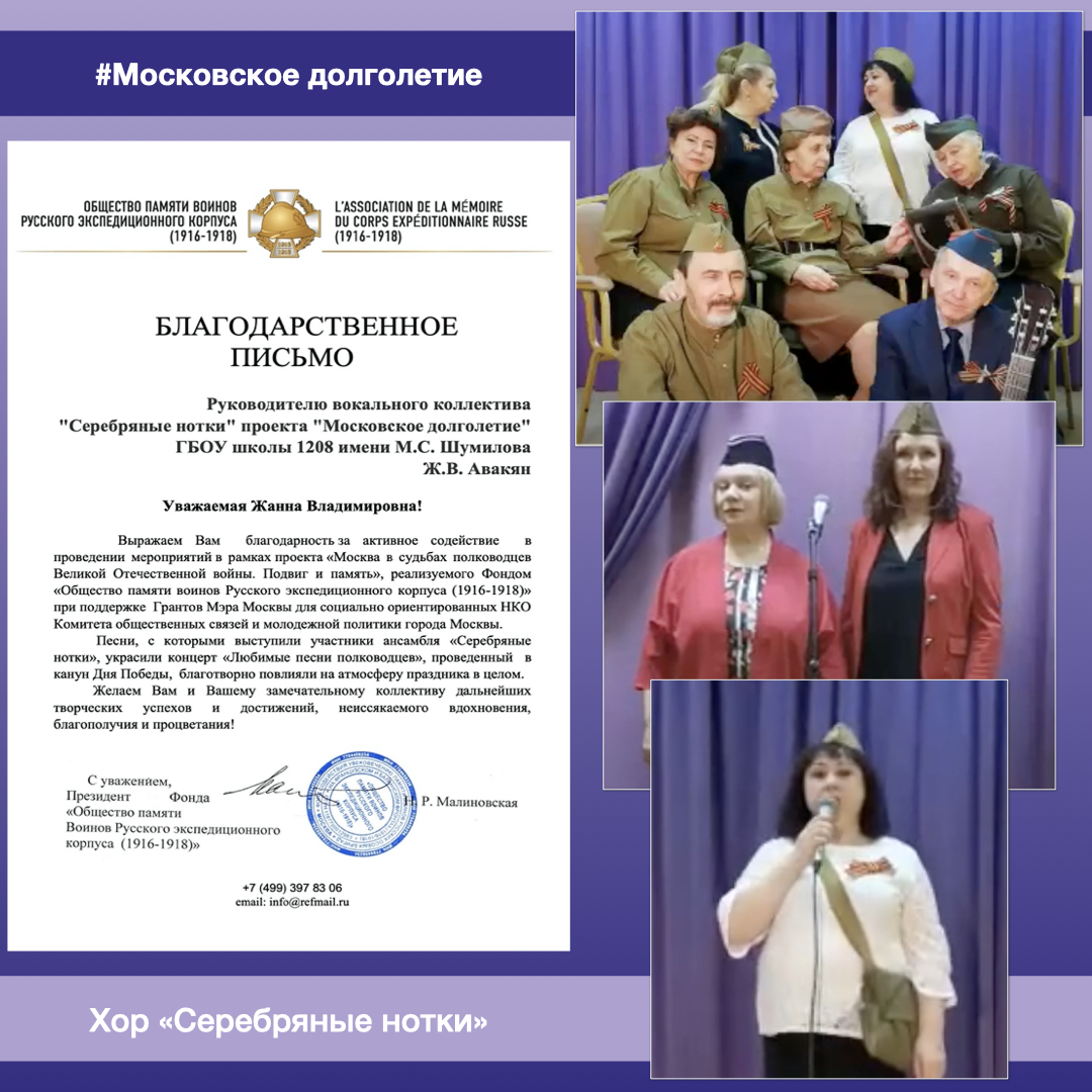Хор «Серебряные нотки» принял участие в концерте «Любимые песни полководцев», проведенный в канун Дня Победы в рамках проекта «Москва в судьбах полководцев Великой Отечественной войны. Подвиг и память»