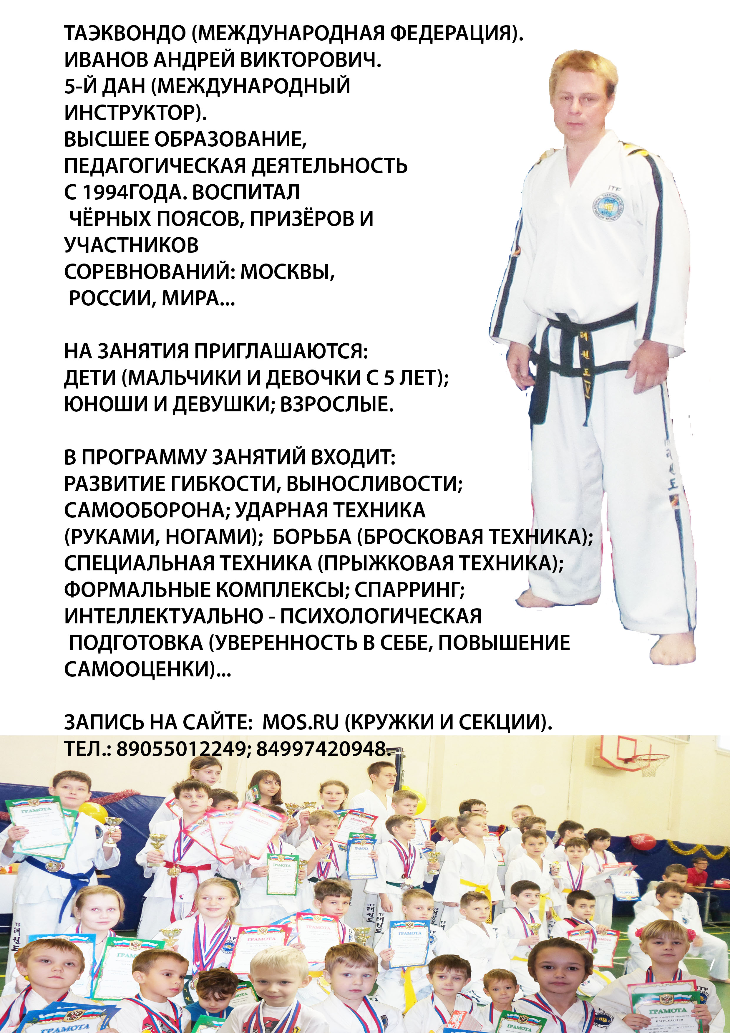 Здравствуйте. предлагаю организовать, на базе учебного учреждения, спортивную секцию таэквондо. С уважением, Иванов Андрей Викторович: международный инструктор, 5-й дан. опыт 25 лет (возраст занимающихся от 4 - х лет).